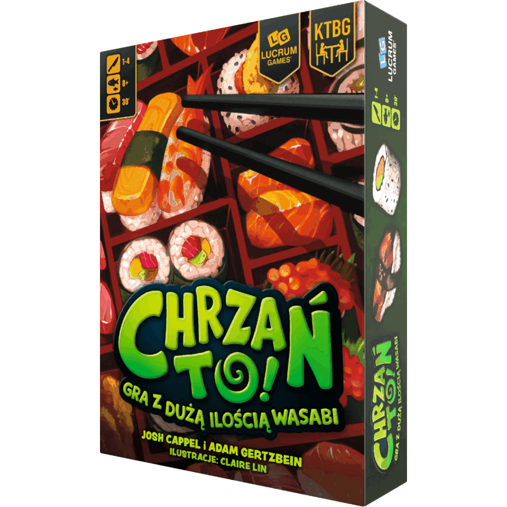 Jeszcze jedna gra związana z sushi. W Chrzań to! rywalizujemy ze sobą o możliwość realizowania najbardziej prestiżowych zamówień na rolki sushi i dania kuchni japońskiej. Możemy skupiać się na ilości, realizując jak najwięcej mniejszych i tańszych zamówień, albo zaryzykować i wykonać mniej, ale za to bardziej wartościowych dań. W każdej turze będziemy dodawać na planszę nowe płytki składników, powodując, że nasza przestrzeń będzie się zmniejszać wraz z upływem gry. Musimy zatem tak układać te płytki, aby zachować jak najbardziej optymalny dla siebie układ, pozwalający zaserwować jak najwięcej dań jednocześnie.
