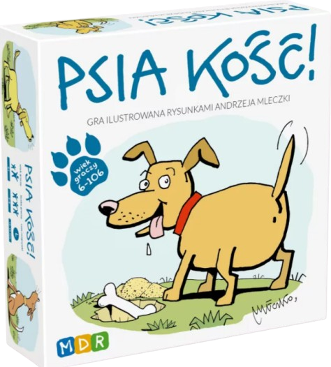 Prosta i tania gra dla całej rodziny, w której to znajdziemy ilustracje od Andrzeja Mleczki. Mamy w niej do czynienia z niezwykłym polowaniem na psie skarby! Wskazać musimy psa, który jest najszybszy i w nagrodę zdobędziemy za to punkty. Gdy zobaczymy psa z kością, krzyczymy Psia kość, dzięki czemu wygramy rozgrywkę. To jeden z tych tytułów, w których mocno liczy się refleks i spostrzegawczość!