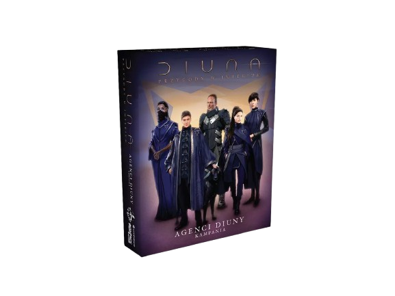 “Agenci Diuny” to kampania fabularna, która oferuje pełne wprowadzenie w świat Diuny oraz w grę “Diuna: Przygody w Imperium”. Produkt ten zawiera wszystko, co potrzebne, aby zacząć zabawę bez żadnych dodatkowych przygotowań. W zestawie znajdziemy pełną 124-stronicową przygodę ze wskazówkami krok po kroku, jak grać, 5 kart postaci członków rodu Nagarów, dwie talie po 50 kart opisujących bohaterów niezależnych, zasoby i atrybuty występujące w grze, 3 materiały dla graczy i 4 mapy stref, 54 żetony i 2 tory do śledzenia punktów Impetu, Zagrożenia i Determinacji, dokładne zasady wydobywania przyprawy, a także 5 specjalnych kości 20-ściennych z symbolem wielkiego czerwia z Arrakis.