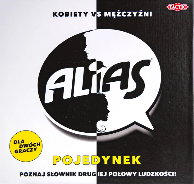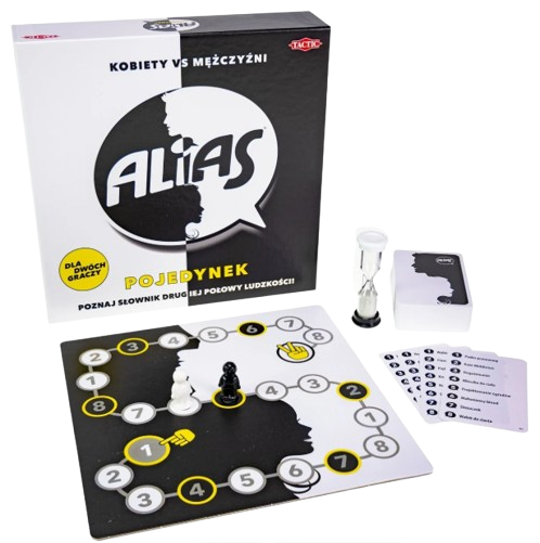 Alias: Kobiety vs. Mężczyźni to dość ciekawa gra towarzyska wydana już wiele lat temu, w której to zmierzyć się ze sobą mogą dwie grupy – po jednej stronie kobiety, zaś po drugiej mężczyźni. Zadaniem graczy jest zgadywanie haseł podpowiadanych przez lidera, a jedna płeć odpowiada na słowa związane z drugą. Teraz na rynku pojawiła się wersja z serii pojedynek, która przeznaczona jest dla 2 osób.